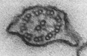 Sea urchin spermatazoa is studied in cross-section. Cross-section micrograph shows spokes which extend from center to peripheral cylinders.