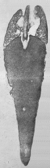 The procedure of trimming requires an intimate knowledge of the anatomy of the tissue, as well as delicacy and patience, since the final result depends largely on precise orientation of the desired cells to the plane of section. The specimen is usually trimmed in the form of a pyramid—with the base about 0.5 millimeter on a side. The sections which are cut from the trimmed block may be about 0.1 millimeter square and can only be seen with the help of a dissecting microscope. When they float from the microtome’s knife-edge onto the fluid surface of the collecting basin, they are collected on a grid which is then placed in the microscope for scrutiny.